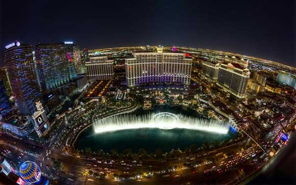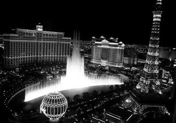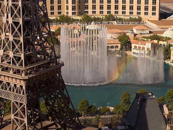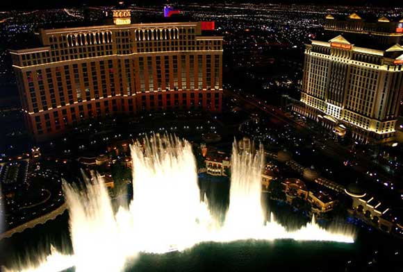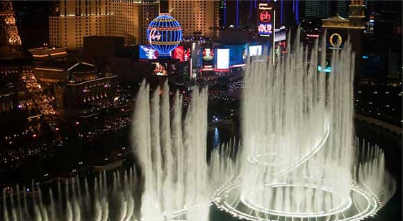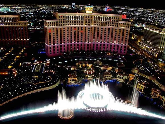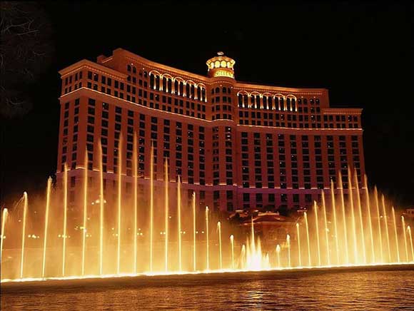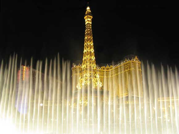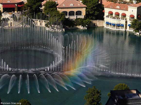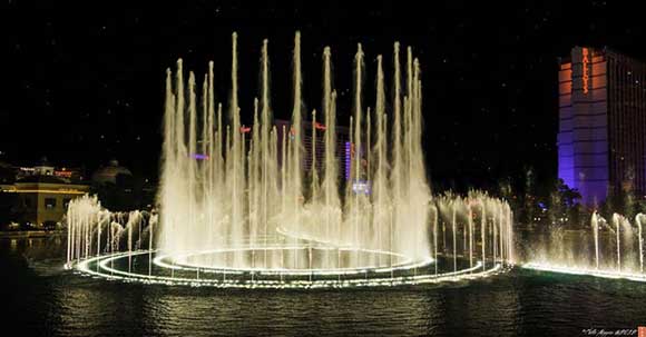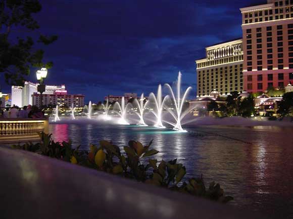 اما آب نمای زیبا این شهر مقابل هتل بلاجیو (Bellagio) میباشد یکی از جلوهای خیره کننده این شهر میباشد. این آب نما شامل نازل های رقصان همراه با موزیک و نور پردازی می باشد. نمایش آب نما صبح و بعد از ظهر هر نیم ساعت و از ساعت 8 شب تا آخر شب هر 15 دقیقه میباشد. این آب نمادارای سنسور باد میباشد و در حین وزیدن بادهای شدید متوقف میشود. بیش از 1200 نازل و 4500 چراغ در ساخت این مجموعه به کار رفته است و هزینه ساخت آن توسط شرکت WET چهل میلیون دلار تخمین زده شده است.